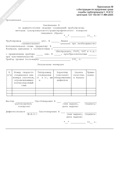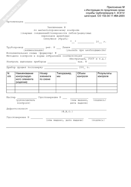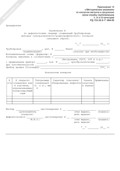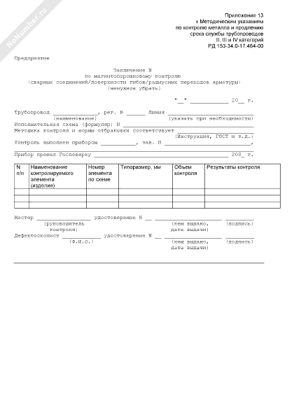 - 427Рекомендуемые формы бланков для оформления материалов по контролю технического состояния трубопровода. Заключение по магнитопорошковому контролю (сварных соединений/поверхности гибов/радиусных переходов арматуры)