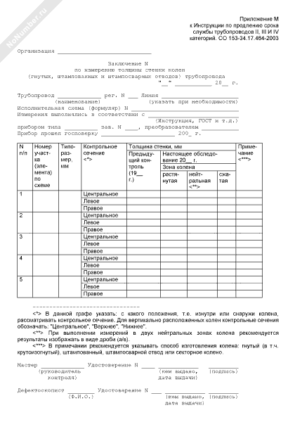 - 430Рекомендуемые формы бланков для оформления материалов по контролю технического состояния. Заключение по измерению толщины стенки колен (гнутых, штампованных и штампосварных отводов) трубопровода