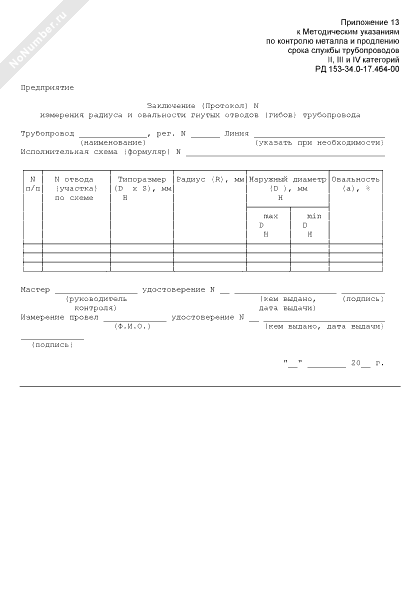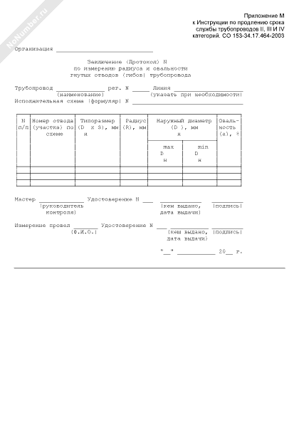 - 425Рекомендуемые формы бланков для оформления материалов по контролю технического состояния. Заключение (Протокол) измерения радиуса и овальности гнутых отводов (гибов) трубопровода