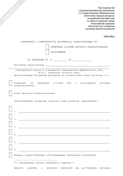 - 108Заключение о комплектности документов, представленных на изменение (расторжение) условий договора водопользования