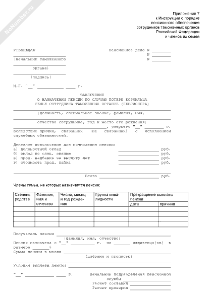 - 110Заключение о назначении пенсии по случаю потери кормильца семье сотрудника таможенных органов (пенсионера)