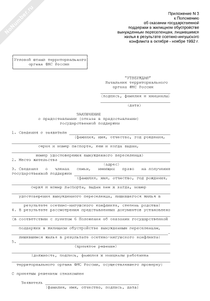 - 166Заключение о предоставлении (отказе в предоставлении) государственной поддержки вынужденному переселенцу, лишившимуся жилья в результате осетино-ингушского конфликта