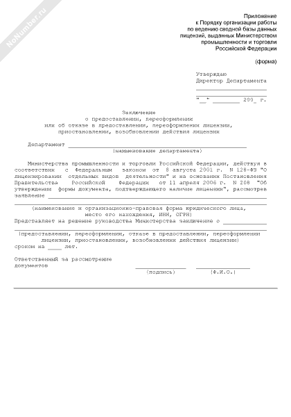 - 178Заключение о предоставлении, переоформлении или об отказе в предоставлении, переоформлении лицензии, приостановлении, возобновлении действия лицензии, выданной Министерством промышленности и торговли Российской Федерации