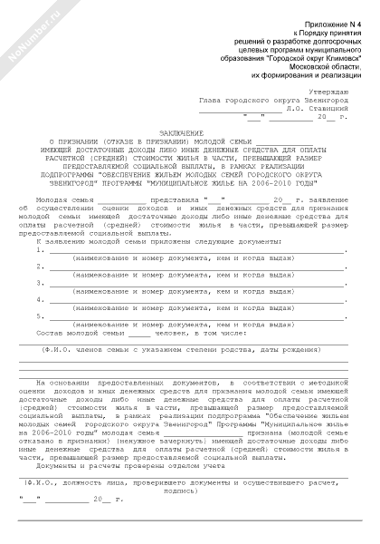 - 163Заключение о признании (отказе в признании) молодой семьи, имеющей достаточные доходы либо иные денежные средства для оплаты расчетной (средней) стоимости жилья в части, превышающей размер предоставляемой социальной выплаты, в рамках реализации подпрограммы «Обеспечение жильем молодых семей городского округа Звенигород» программы «Муниципальное жилье на 2006-2010 годы»