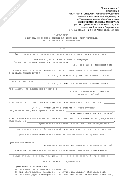 - 177Заключение о признании жилого помещения пригодным (непригодным) для постоянного проживания на территории городского поселения Егорьевск Егорьевского муниципального района Московской области