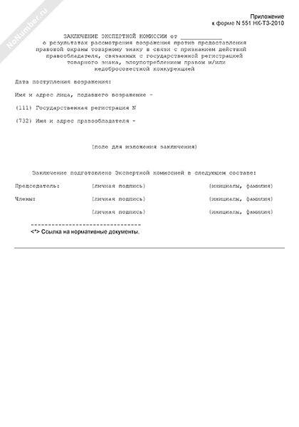 Заключение экспертной комиссии о результатах рассмотрения возражения против предоставления правовой охраны товарному знаку в связи с признанием действий правообладателя, связанных с государственной регистрацией товарного знака, злоупотреблением правом и/или недобросовестной конкуренцией (приложение к форме N 551 НК-ТЗ-2010)