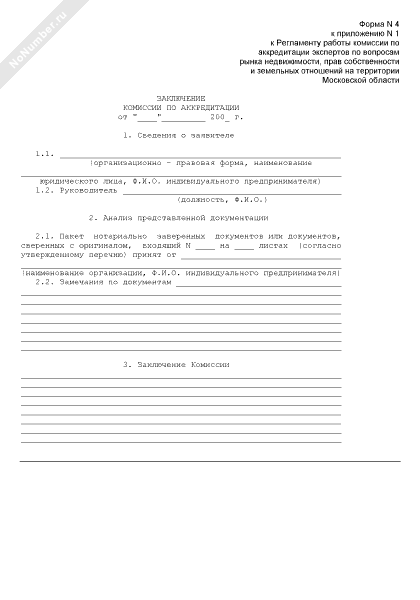 Заключение комиссии по аккредитации экспертов по вопросам рынка недвижимости, прав собственности и земельных отношений на территории Московской области (форма № 4)
