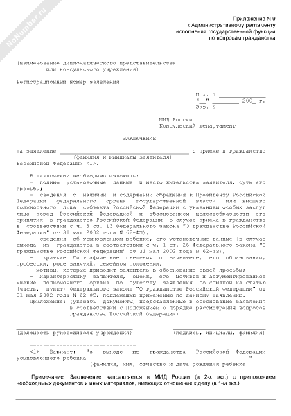 Заключение МИД России, консульского департамента на заявление гражданина о приеме в гражданство Российской Федерации (рекомендуемый образец заполнения)