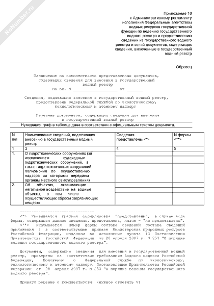 Заключение на комплектность представленных документов, содержащих сведения для внесения в государственный водный реестр, предоставленные Федеральной службой по экологическому, технологическому и атомному надзору (рекомендуемый образец заполнения)