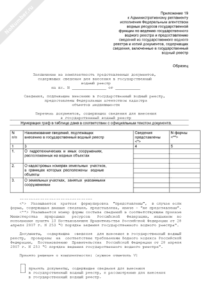 Заключение на комплектность представленных документов, содержащих сведения для внесения в государственный водный реестр, предоставленные Федеральным агентством кадастра объектов недвижимости (рекомендуемый образец заполнения)