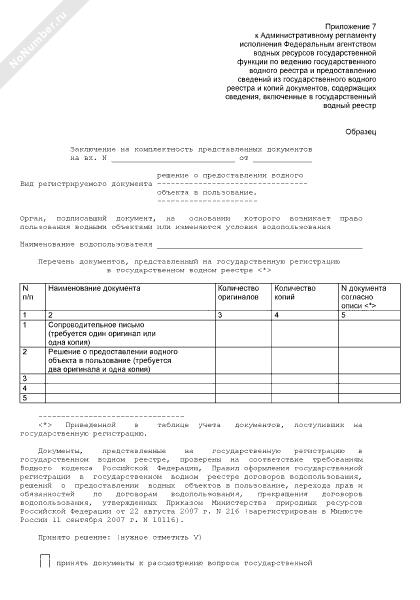 Заключение на комплектность представленных документов (регистрируемый документ: решение о предоставлении водного объекта в пользование) (рекомендуемый образец заполнения)