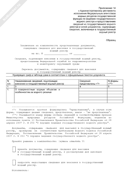 Заключение на комплектность представленных документов, содержащих сведения для внесения в государственный водный реестр, предоставленные Федеральной службой по гидрометеорологии и мониторингу окружающей среды (рекомендуемый образец заполнения)