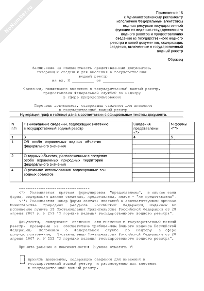 Заключение на комплектность представленных документов, содержащих сведения для внесения в государственный водный реестр, предоставленные Федеральной службой по надзору в сфере природопользования (рекомендуемый образец заполнения)