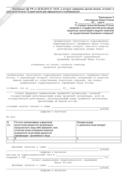 Заключение об оплате уставного капитала кредитной организации (рекомендуемый образец заполнения)