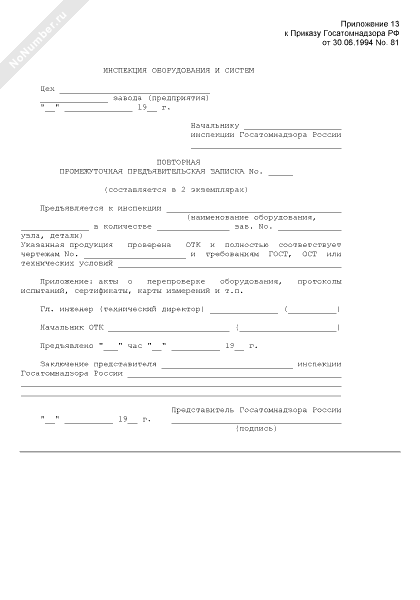 - 66Повторная промежуточная предъявительская записка на инспектирование проверенного ОТК оборудования для объекта атомной энергетики при неудовлетворительных результатах предыдущей инспекции оборудования