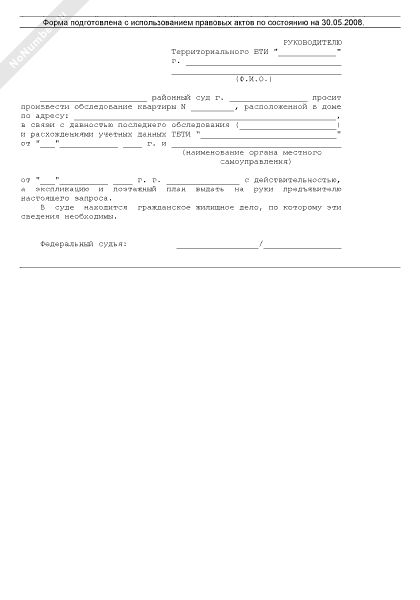 - 222Судебный запрос об обследовании квартиры в связи с расхождениями учетных данных ТБТИ и органа местного самоуправления с действительностью