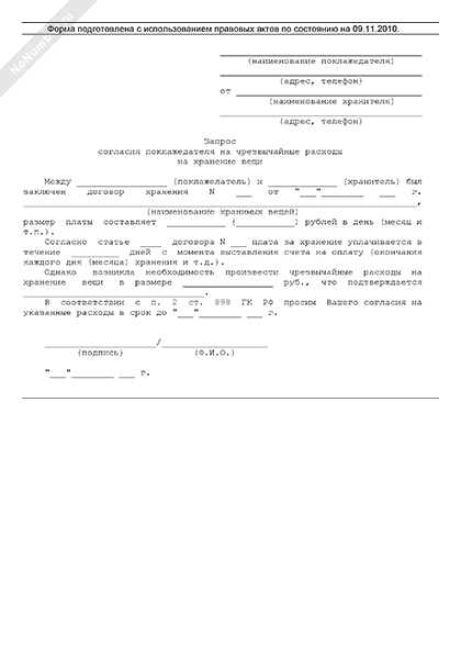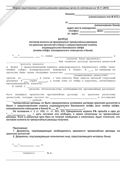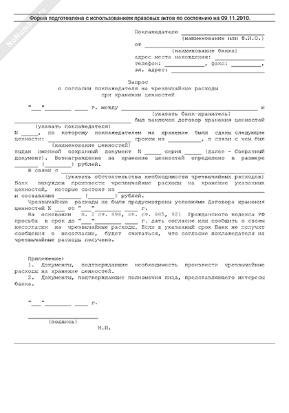 - 224Запрос банка о согласии поклажедателя на чрезвычайные расходы при хранении ценностей