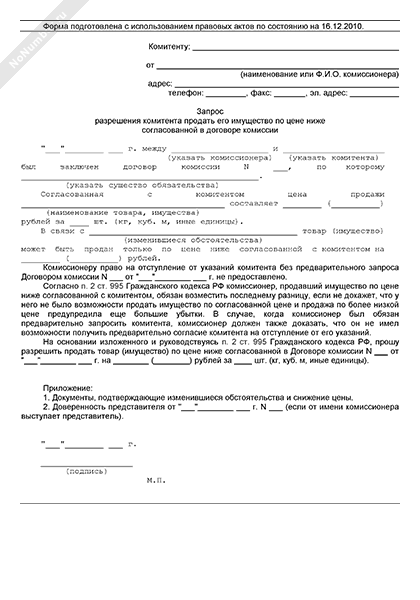 - 229Запрос комиссионера о разрешении комитента продать его имущество по цене ниже согласованной в договоре комиссии