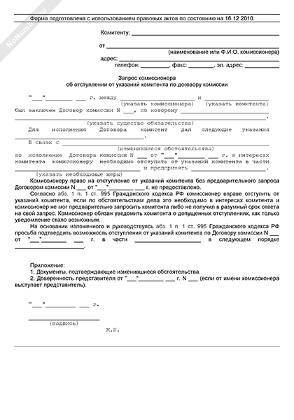 - 228Запрос комиссионера об отступлении от указаний комитента по договору комиссии