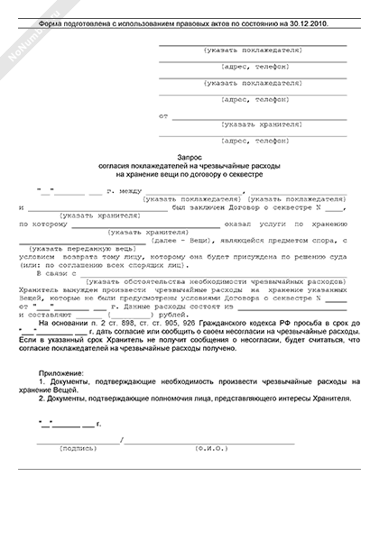 - 239Запрос согласия поклажедателей на чрезвычайные расходы на хранение вещи по договору о секвестре (п. 2 ст. 898, ст. ст. 905, 926 ГК РФ)