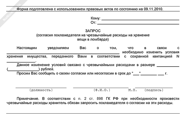 - 237Запрос согласия поклажедателя на чрезвычайные расходы на хранение вещи в ломбарде