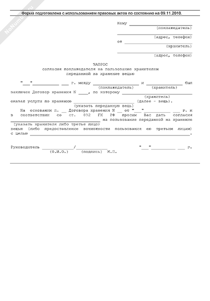 - 235Запрос согласия поклажедателя на пользование хранителем переданной на хранение вещью (предоставление возможности пользования ею третьим лицам)