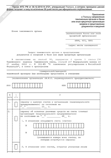 - 240Запрос таможенного органа о представлении документов и сведений в банк или иную кредитную организацию в связи с проведением камеральной/выездной таможенной проверки юридического лица, индивидуального предпринимателя