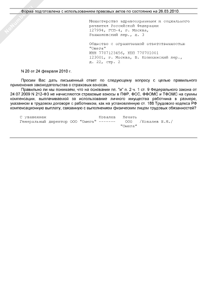 - 21Запрос в Минздравсоцразвития России для разъяснения вопроса с целью правильного применения законодательства о страховых взносах (образец составления)