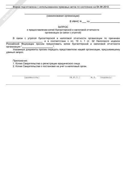 - 26Запрос в налоговый орган о предоставлении копий бухгалтерской и налоговой отчетности организации (в связи с утратой)