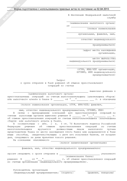 - 23Запрос в налоговый орган о сроке отправки в банк решения об отмене приостановления операций по счетам
