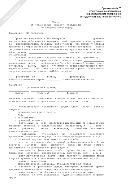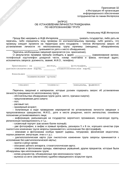 - 30Запрос в национальное центральное бюро Интерпола об установлении личности гражданина по неопознанному трупу