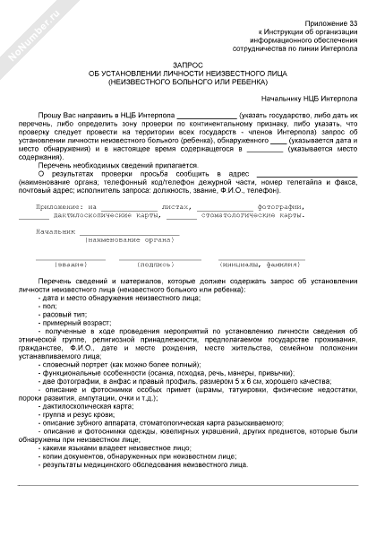 - 31Запрос в национальное центральное бюро Интерпола об установлении личности неизвестного лица (неизвестного больного или ребенка)