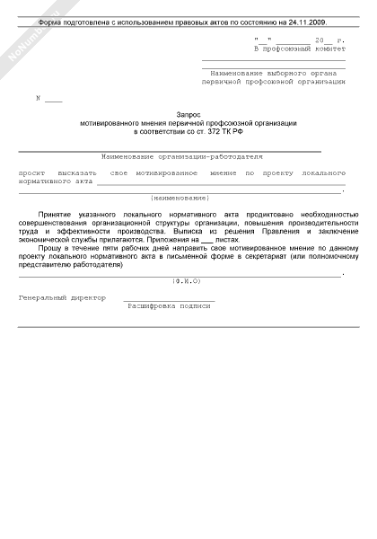 - 76Запрос мотивированного мнения первичной профсоюзной организации в соответствии со ст. 372 ТК РФ по проекту локального нормативного акта