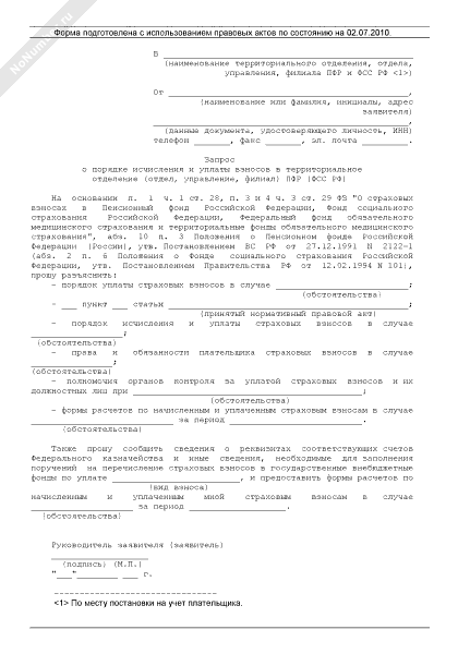 - 125Запрос о порядке исчисления и уплаты взносов в территориальные отделения или отделы (управления, филиалы) ПФР и ФСС РФ