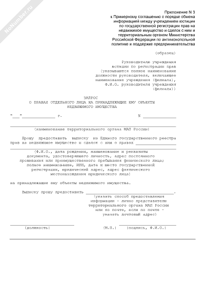 - 126Запрос о правах отдельного лица на принадлежащие ему объекты недвижимого имущества (приложение к примерному соглашению о порядке обмена информацией между учреждением юстиции по государственной регистрации прав на недвижимое имущество и сделок с ним и территориальным органом Министерства Российской Федерации по антимонопольной политике и поддержке предпринимательства)