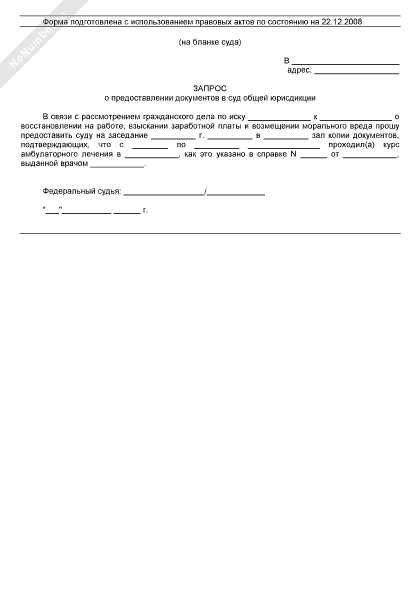 - 135Запрос о предоставлении документов о прохождении курса амбулаторного лечения в суд общей юрисдикции в связи с рассмотрением гражданского дела по иску о восстановлении на работе, взыскании заработной платы и возмещении морального вреда