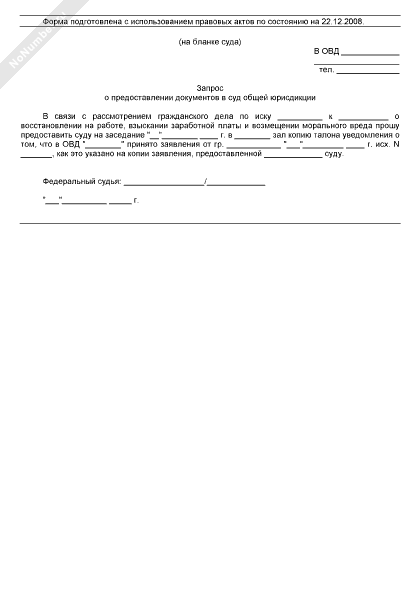 - 134Запрос о предоставлении документов в суд общей юрисдикции в связи с рассмотрением гражданского дела по иску о восстановлении на работе, взыскании заработной платы и возмещении морального вреда