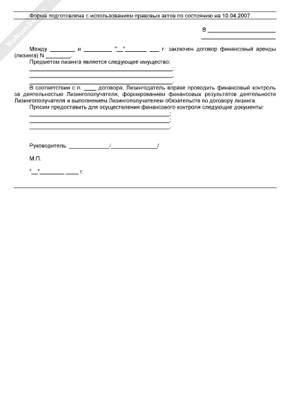 - 127Запрос о предоставлении информации для осуществления финансового контроля за деятельностью лизингополучателя (приложение к договору финансовой аренды (лизинга) движимого имущества)