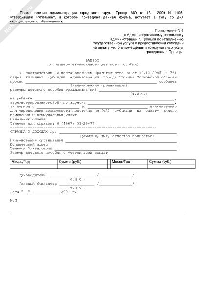 - 166Запрос о размере ежемесячного детского пособия на ребенка жителя г. Троицка Московской области для получения им субсидии на оплату жилого помещения и коммунальных услуг