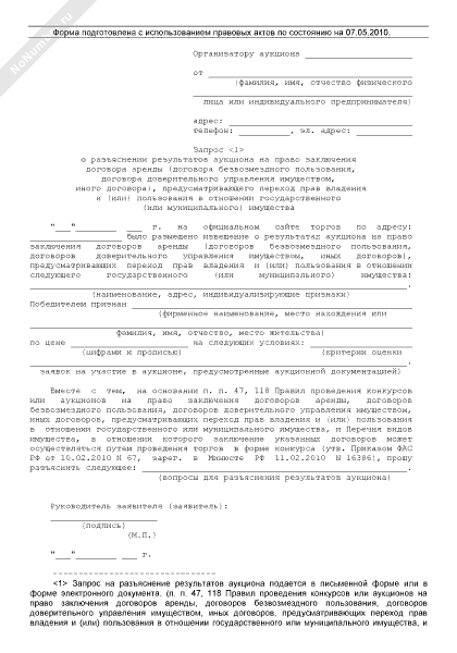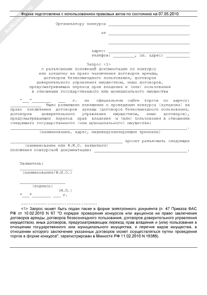 - 169Запрос о разъяснении положений документации по конкурсу или аукциону на право заключения договоров аренды, договоров безвозмездного пользования, договоров доверительного управления имуществом, иных договоров, предусматривающих переход прав владения и (или) пользования в отношении государственного или муниципального имущества