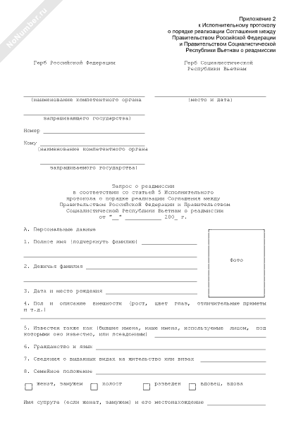 - 172Запрос о реадмиссии в соответствии со статьей 5 Исполнительного протокола о порядке реализации Соглашения между Правительством Российской Федерации и Правительством Социалистической Республики Вьетнам о реадмиссии