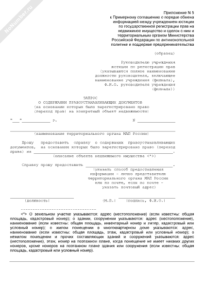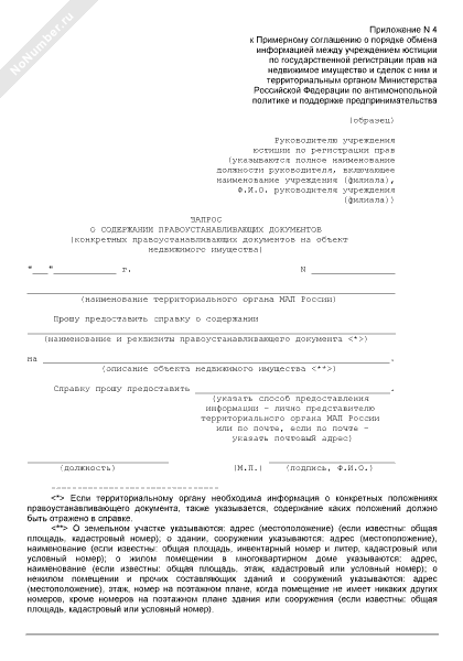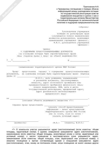 - 174Запрос о содержании правоустанавливающих документов (конкретных правоустанавливающих документов на объект недвижимого имущества) (приложение к примерному соглашению о порядке обмена информацией между учреждением юстиции по государственной регистрации прав на недвижимое имущество и сделок с ним и территориальным органом Министерства Российской Федерации по антимонопольной политике и поддержке предпринимательства)