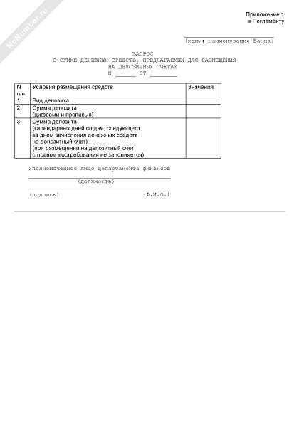- 178Запрос о сумме денежных средств, предлагаемых для размещения на депозитных счетах (приложение к регламенту взаимодействия Департамента финансов города Москвы и кредитных организаций при размещении временно свободных средств бюджета города Москвы на банковских депозитах)