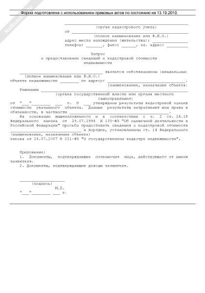 Запрос о предоставлении сведений о кадастровой стоимости недвижимости