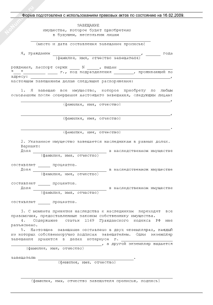 Завещание имущества, которое будет приобретено в будущем, нескольким лицам (рекомендуемый образец заполнения)