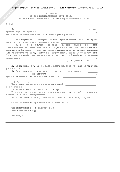 Завещание на все принадлежащее имущество, с подназначением наследников — несовершеннолетних детей (рекомендуемый образец заполнения)
