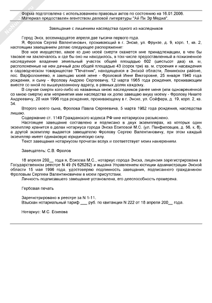 Завещание с лишением наследства одного из наследников (рекомендуемый образец заполнения)