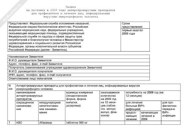 - 435Заявка на поставку в 2009 году антиретровирусных препаратов для профилактики и лечения лиц, инфицированных вирусами иммунодефицита человека