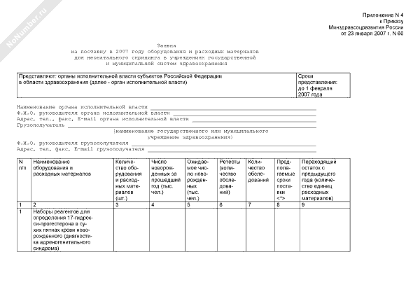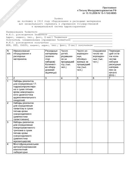 - 434Заявка на поставку в 2010 году оборудования и расходных материалов для неонатального скрининга в учреждения государственной и муниципальной систем здравоохранения