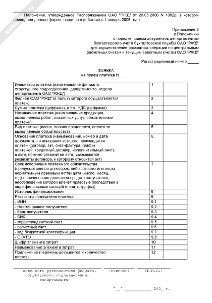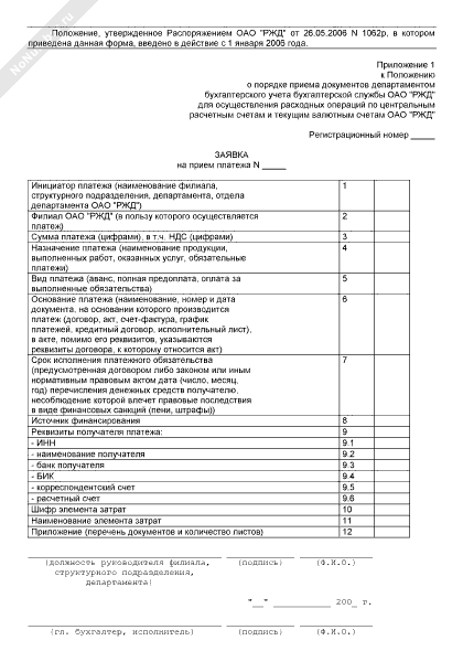 - 495Заявка на прием платежа, представляемая в департамент бухгалтерского учета бухгалтерской службы ОАО «РЖД»